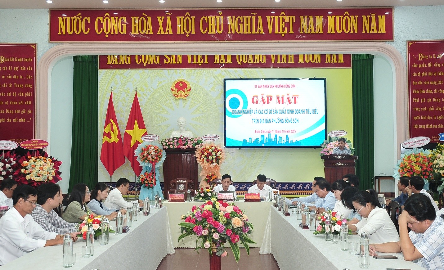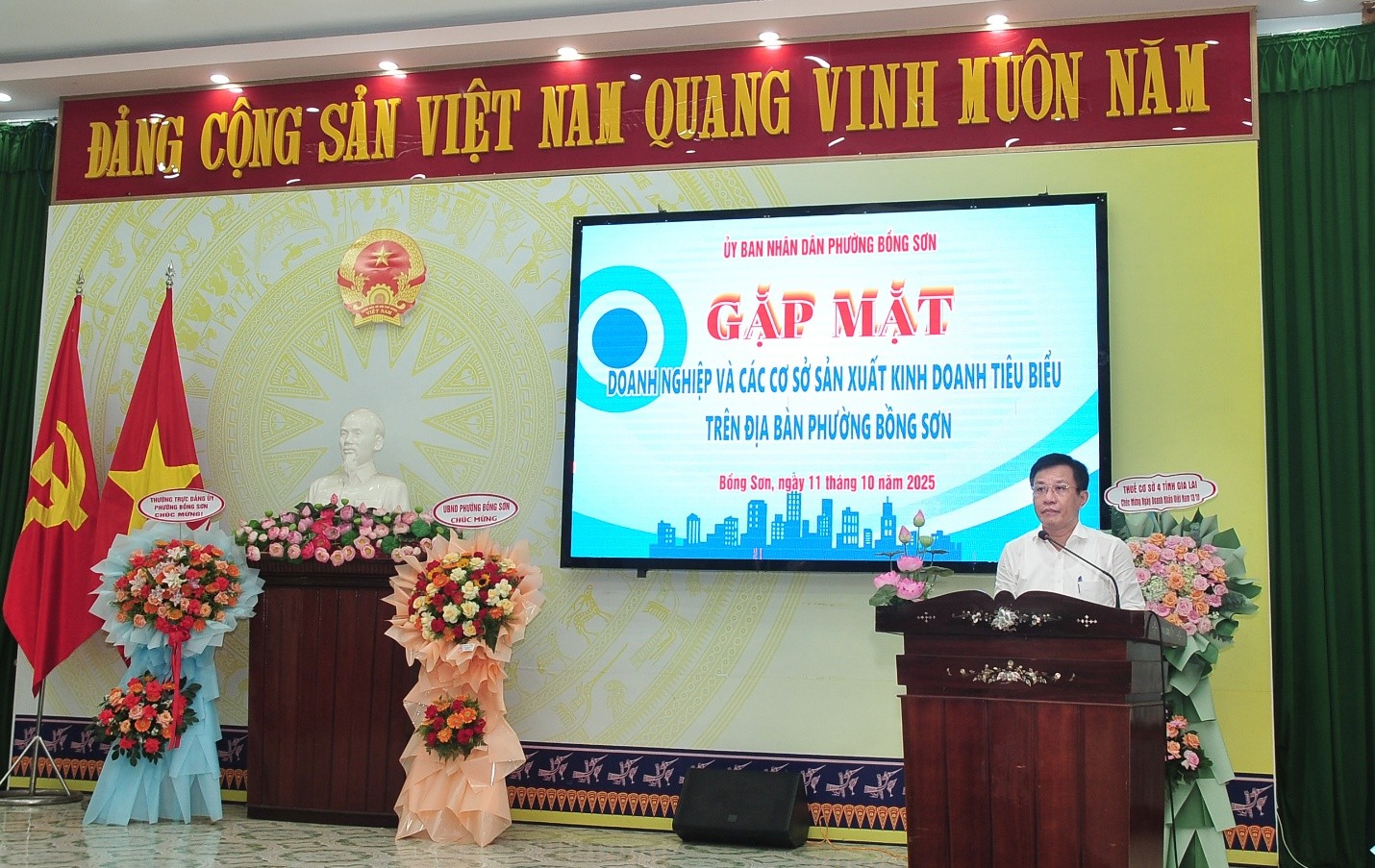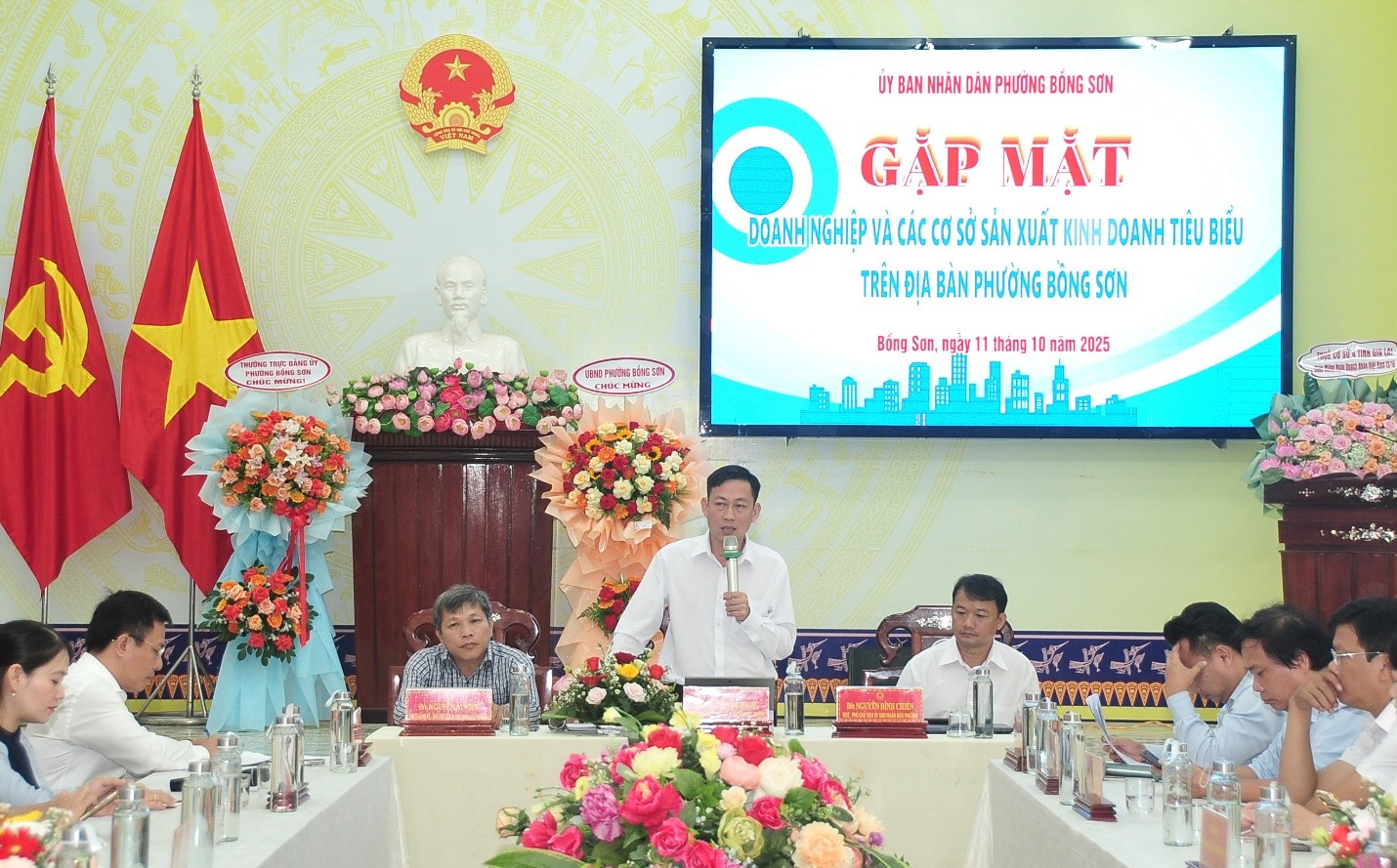 Phát biểu chúc mừng tại buổi gặp mặt, đồng chí Bí thư Đảng ủy phường Võ Ngọc Bình ghi nhận và biểu dương tinh thần nỗ lực, năng động, sáng tạo của các doanh nghiệp, doanh nhân, đặc biệt là trong giai đoạn phường mới thành lập và đang từng bước ổn định, phát triển. Phát huy tinh thần “Kinh doanh là phụng sự Tổ quốc”, Đảng ủy – UBND phường Bồng Sơn xác định phương châm hành động “Lấy người dân và doanh nghiệp làm trung tâm phục vụ”, “Doanh nghiệp phát triển - phường phát triển; doanh nhân thành công - địa phương giàu mạnh”, địa phương cam kết sẽ tiếp tục đồng hành cùng doanh nghiệp, lắng nghe, hỗ trợ, tháo gỡ khó khăn, tạo môi trường đầu tư, kinh doanh an toàn, minh bạch, hiệu quả; đồng thời, đẩy mạnh cải cách hành chính, chuyển đổi số, hỗ trợ doanh nghiệp ứng dụng công nghệ, mở rộng sản xuất, nâng cao năng lực cạnh tranh.