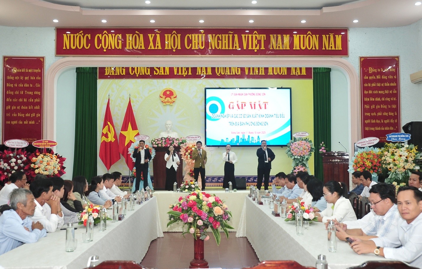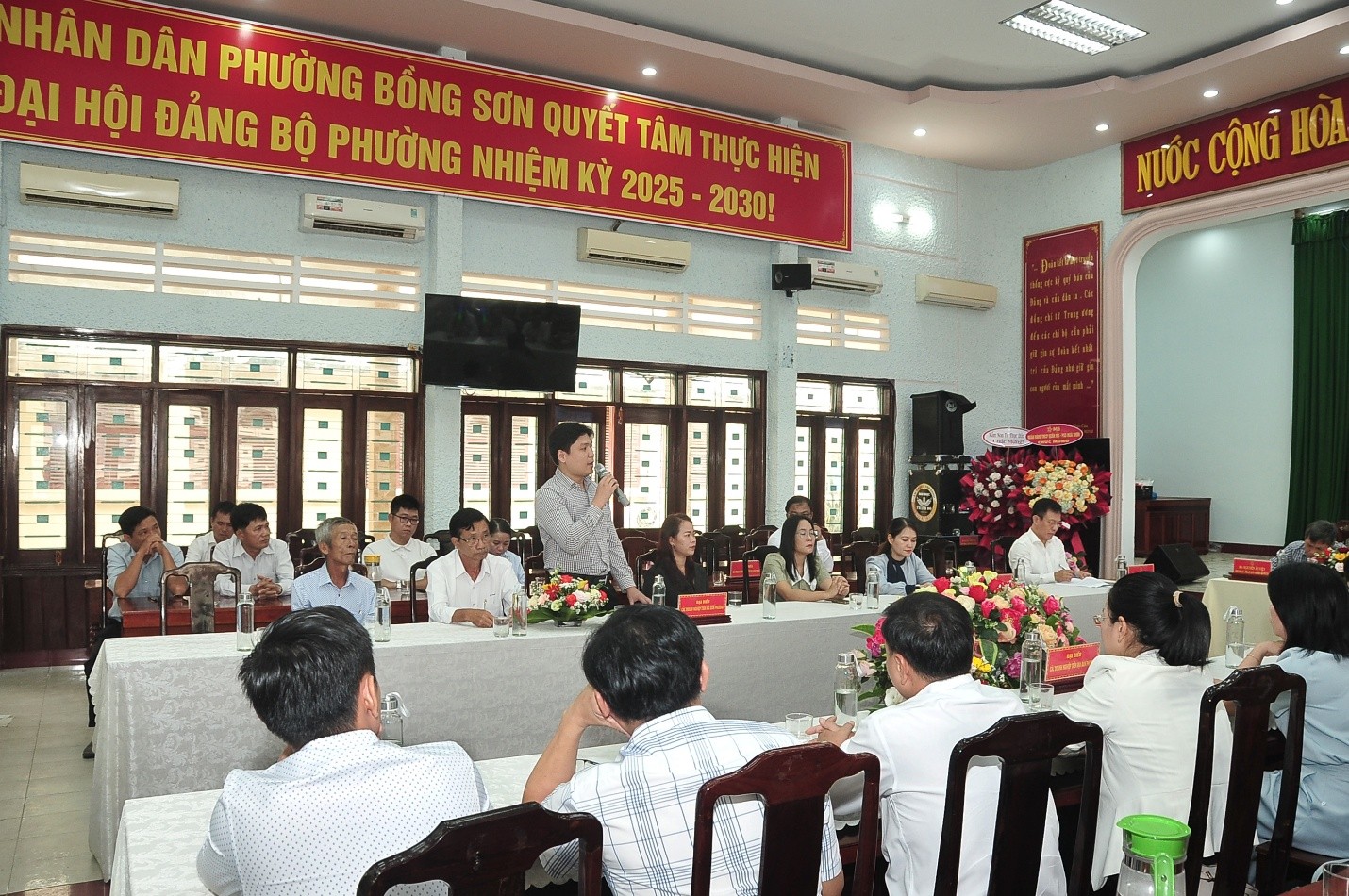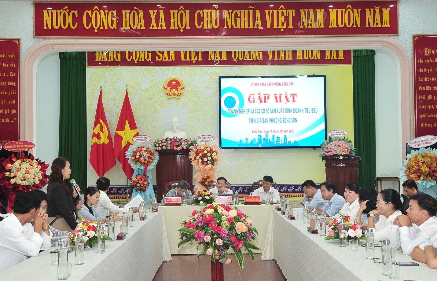 Phát biểu chúc mừng tại buổi gặp mặt, đồng chí Bí thư Đảng ủy phường Võ Ngọc Bình ghi nhận và biểu dương tinh thần nỗ lực, năng động, sáng tạo của các doanh nghiệp, doanh nhân, đặc biệt là trong giai đoạn phường mới thành lập và đang từng bước ổn định, phát triển. Phát huy tinh thần “Kinh doanh là phụng sự Tổ quốc”, Đảng ủy – UBND phường Bồng Sơn xác định phương châm hành động “Lấy người dân và doanh nghiệp làm trung tâm phục vụ”, “Doanh nghiệp phát triển - phường phát triển; doanh nhân thành công - địa phương giàu mạnh”, địa phương cam kết sẽ tiếp tục đồng hành cùng doanh nghiệp, lắng nghe, hỗ trợ, tháo gỡ khó khăn, tạo môi trường đầu tư, kinh doanh an toàn, minh bạch, hiệu quả; đồng thời, đẩy mạnh cải cách hành chính, chuyển đổi số, hỗ trợ doanh nghiệp ứng dụng công nghệ, mở rộng sản xuất, nâng cao năng lực cạnh tranh.