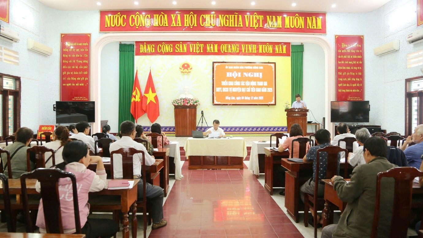 Sáng ngày 04/12/2025, UBND phường Bồng Sơn đã tổ chức Hội nghị triển khai công tác vận động tham gia BHYT, BHXH tự nguyện nhằm thực hiện đạt chỉ tiêu được giao trong năm 2025. Đồng chí Nguyễn Đình Chiến – Phó Chủ tịch UBND phường chủ trì Hội nghị. Dự có bà Bùi Thị Kim Yến – Giám đốc BHXH Hoài Nhơn, đại biểu Công ty Bảo hiểm An sinh Bình Định; lãnh đạo các Phòng, Hội đoàn thể cùng trưởng 21 khu phố và cộng tác viên thu BHYT, BHXH trên địa bàn.