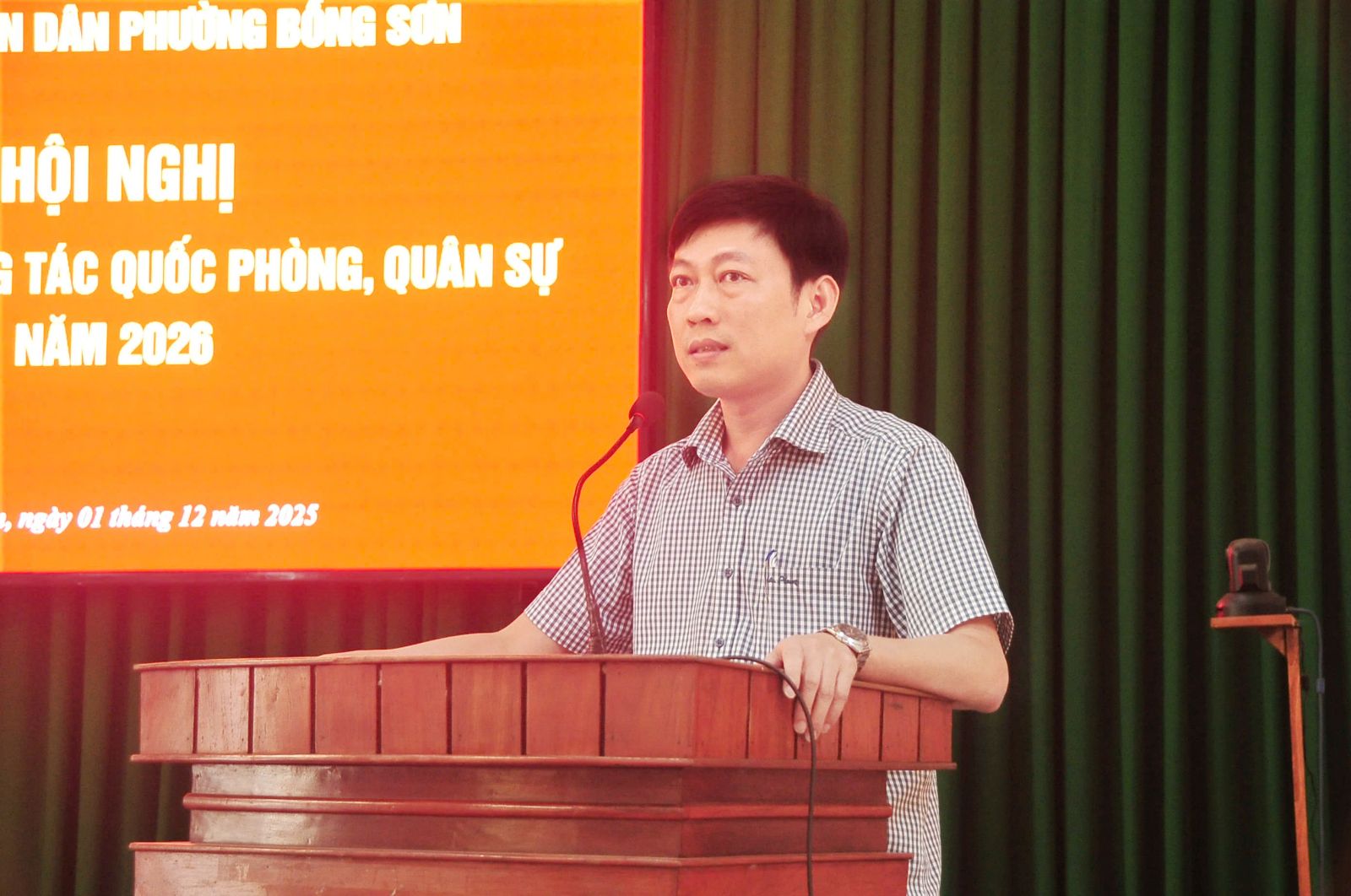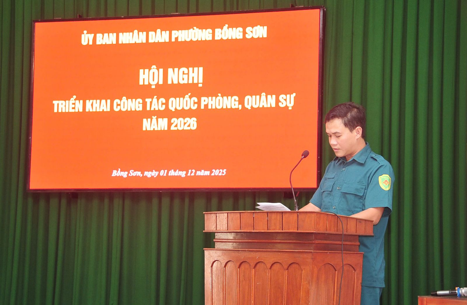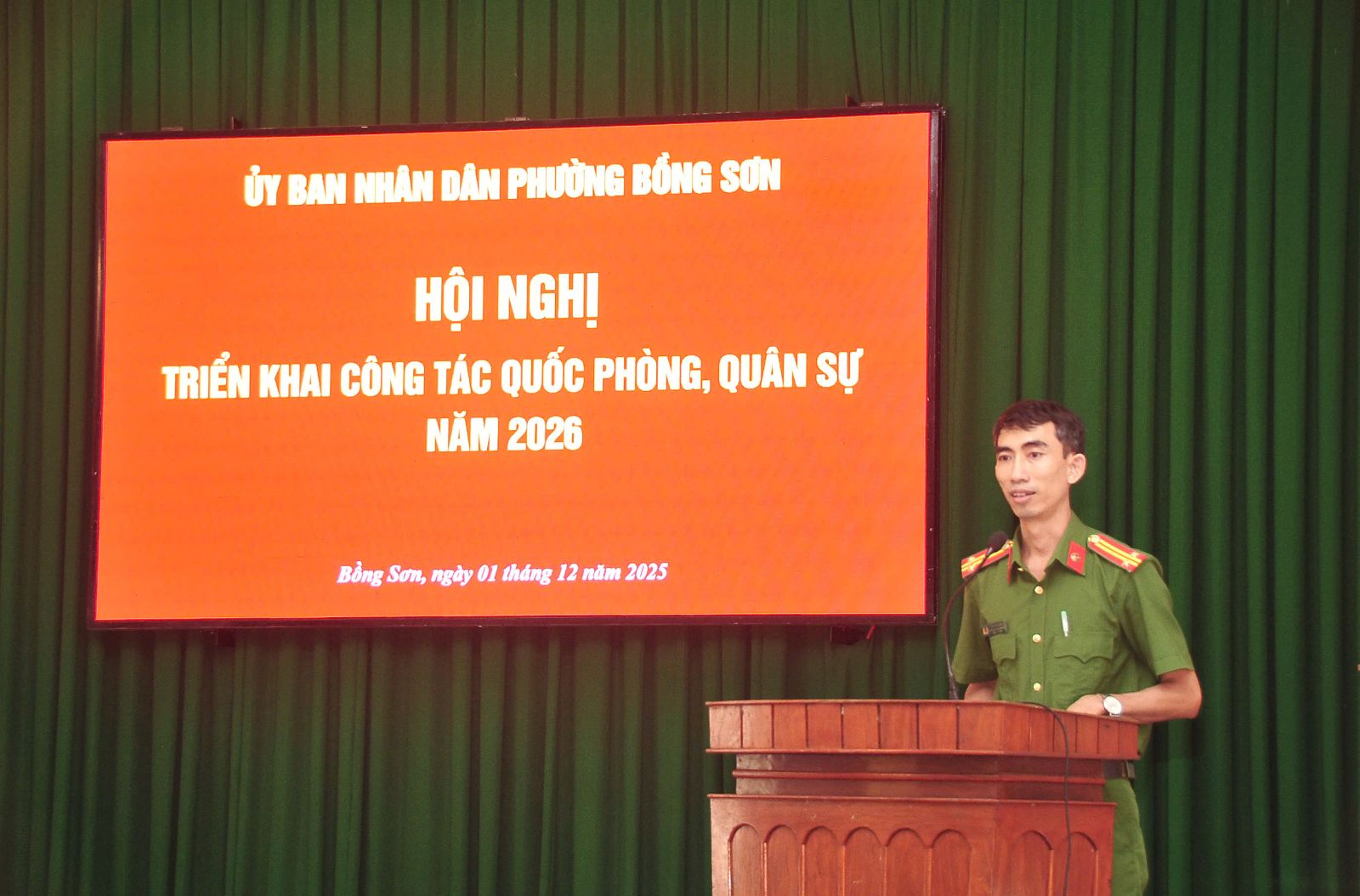 Chiều ngày 01/12/2025, UBND phường Bồng Sơn đã tổ chức Hội nghị báo cáo kết quả thực hiện nhiệm vụ quốc phòng, quân sự năm 2025 và triển khai phương hướng, nhiệm vụ quốc phòng, quân sự năm 2026.